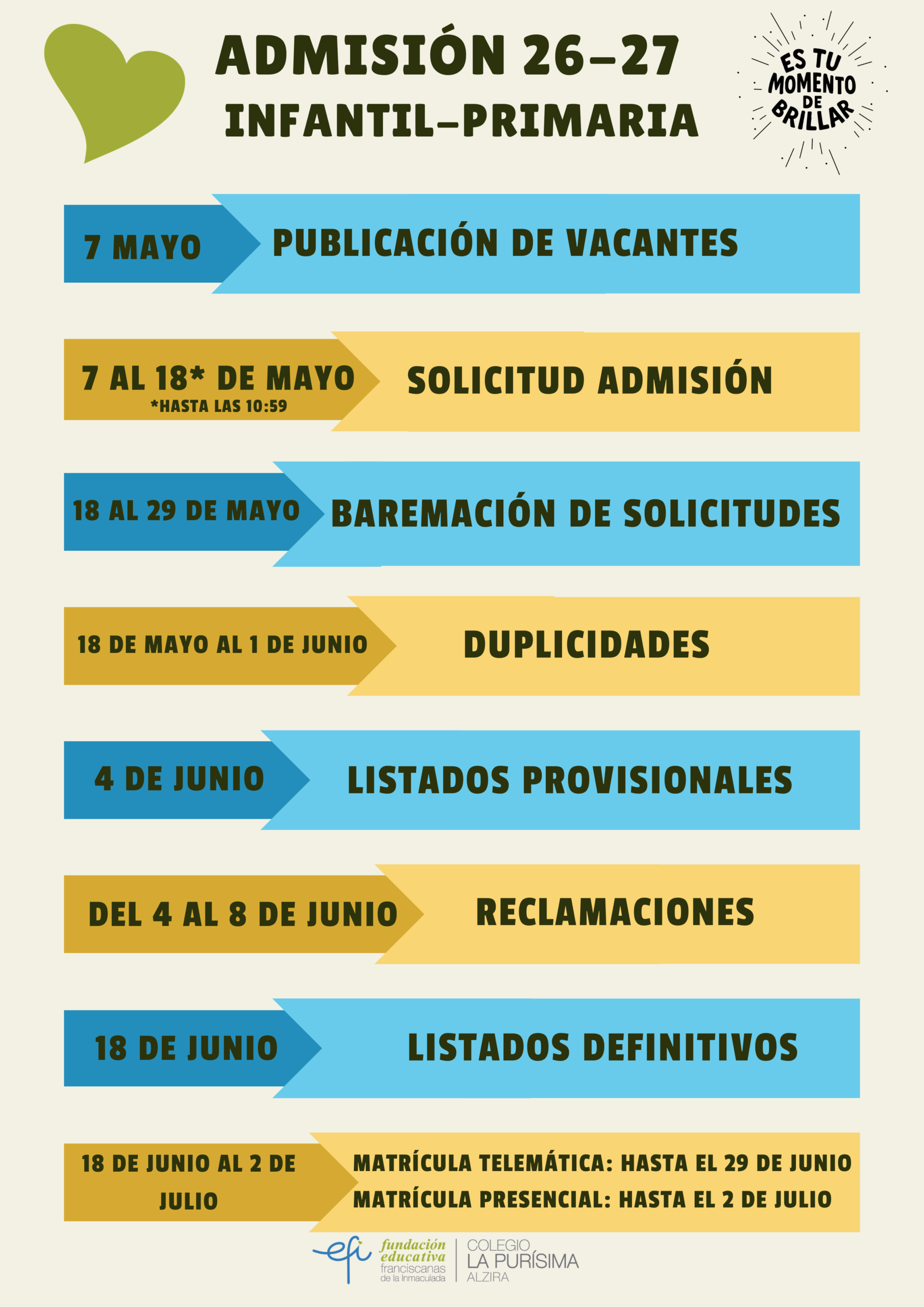 DOGV 10313 (02-03-2026): RESOLUCIÓN de 25 de febrero de 2026, de la Dirección General de Centros Docentes, por la que se establece el calendario y se dictan instrucciones respecto al procedimiento de admisión del alumnado en los centros docentes sostenidos con fondos públicos de la Comunitat Valenciana que imparten enseñanzas de Educación Infantil, Educación Primaria, Educación Secundaria Obligatoria y Bachillerato, y en los centros de Educación Especial, para el curso 2026-2027.